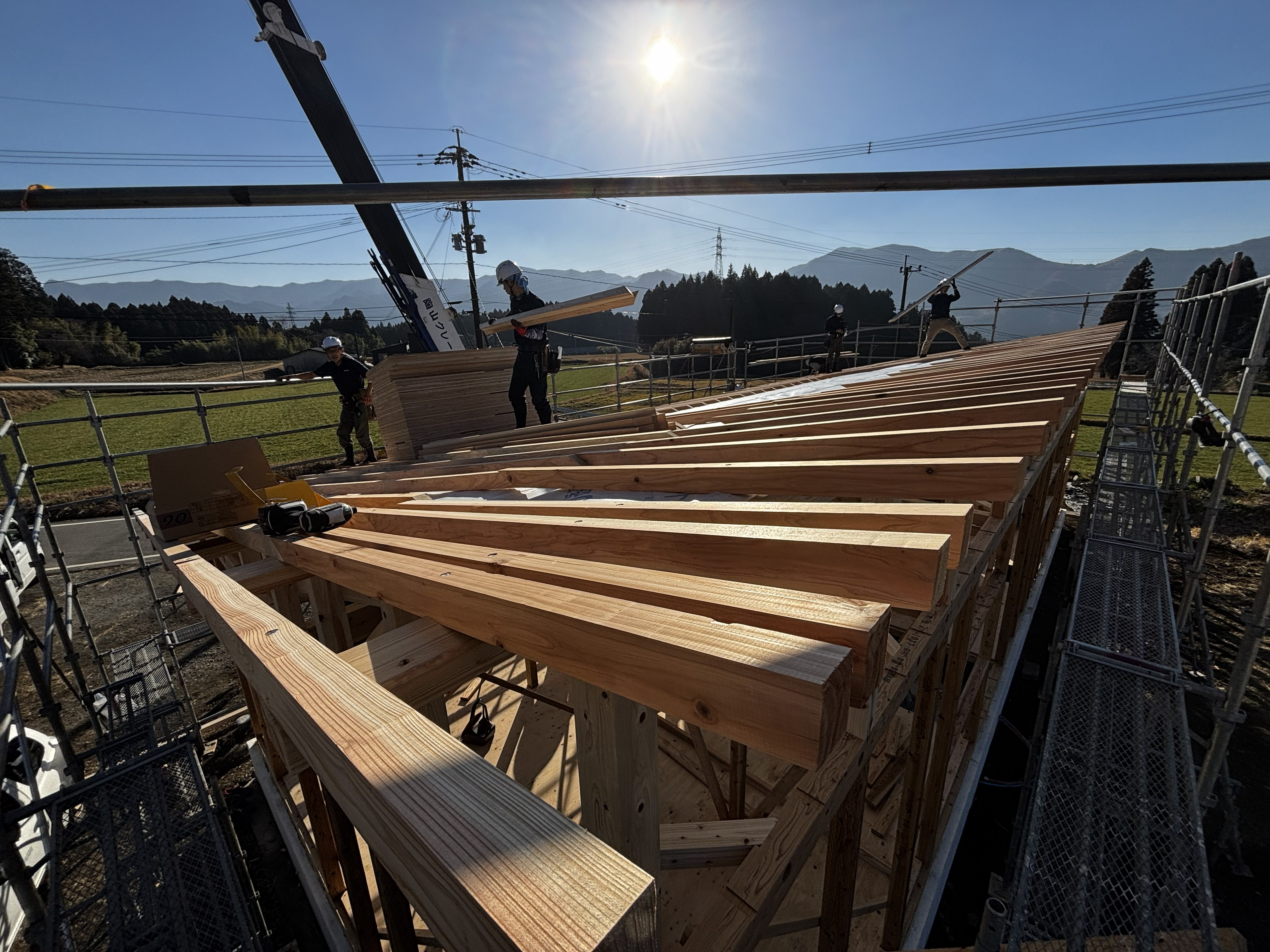 上棟 2026/01/16 【上棟】TS・A様邸 本日は、南阿蘇村の現場にてTS・A様邸の上棟を執り行いました。朝から天候にも恵まれ、無事に棟が上がり、建物の全体像が見えてまいりました。ここからいよいよ本格的な仕上げ工事に入ります。安全第一で作業を進めながら、TS・A様ご家族が快適に暮らせる素敵なお住まいを丁寧に形にしてまいります。完成まで、どうぞ楽しみにお待ちください。
