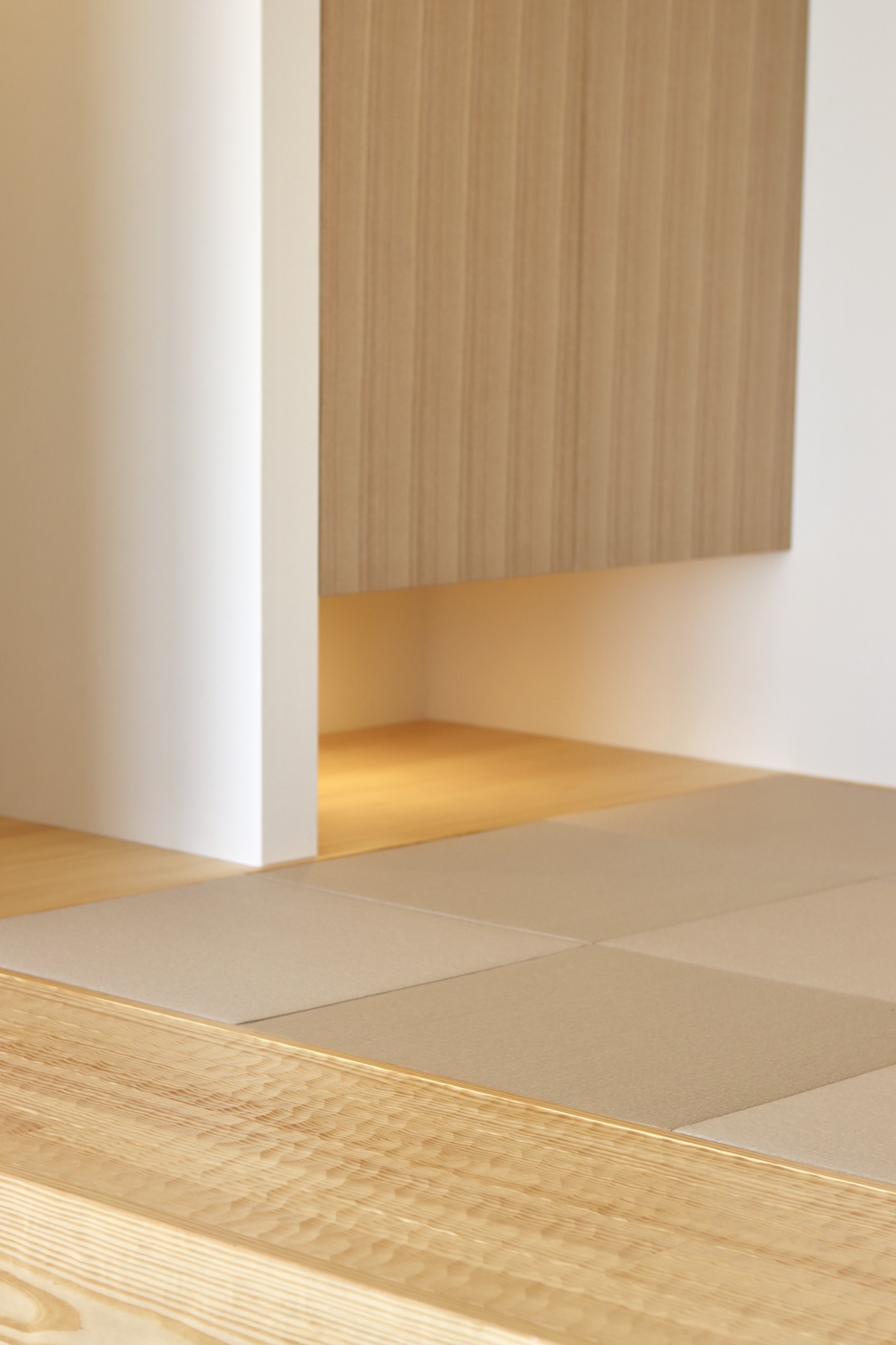 さらに、無垢材のあたたかな質感を随所に取り入れ、畳コーナーにはスプーンカット仕上げの無垢材をあしらうなど