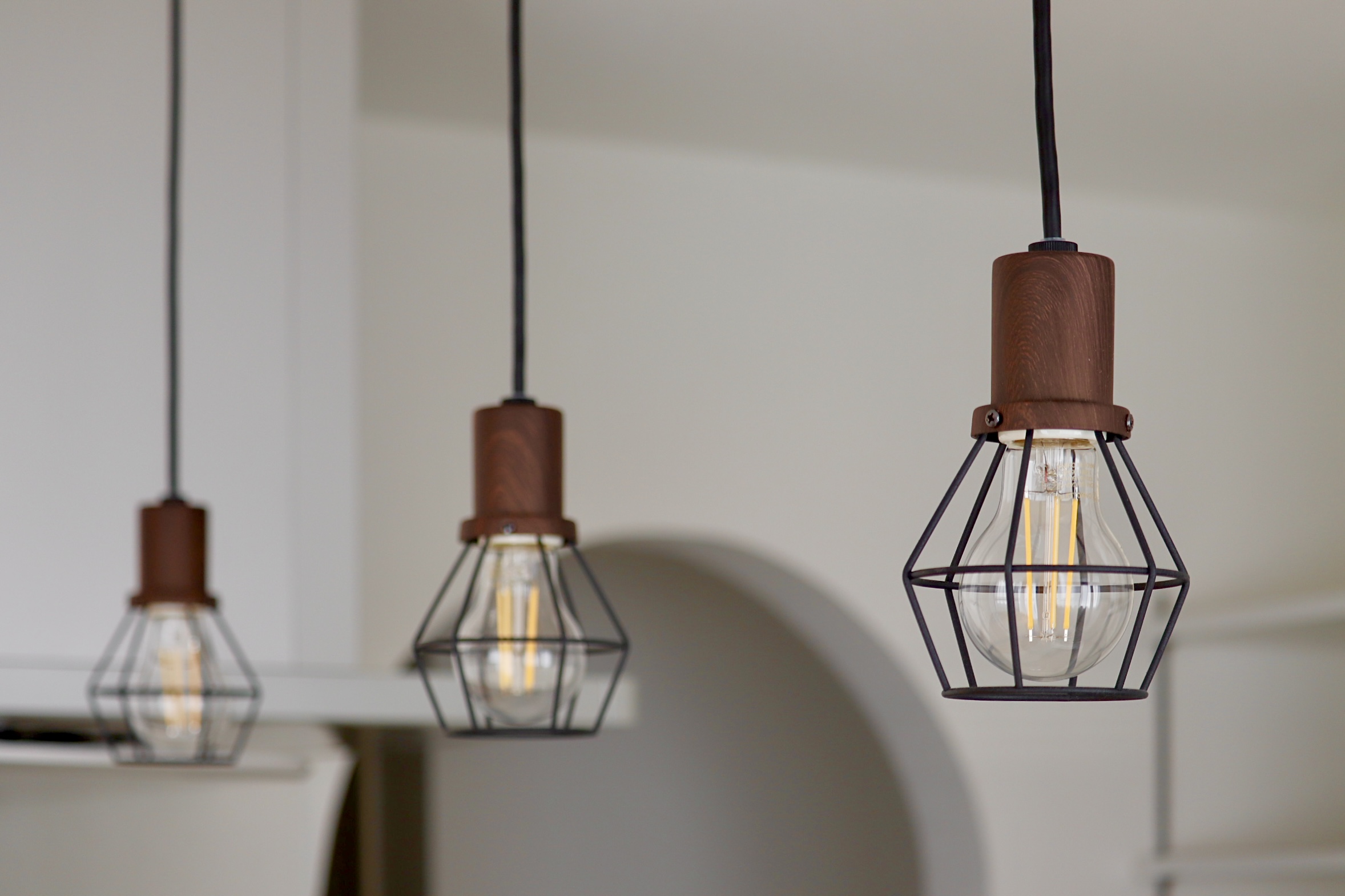 カウンターキッチンに取り付けた電球デザインの照明がさりげないアクセントとなり、可愛らしさと上品さが調和した心地よい住まいに仕上がっています。