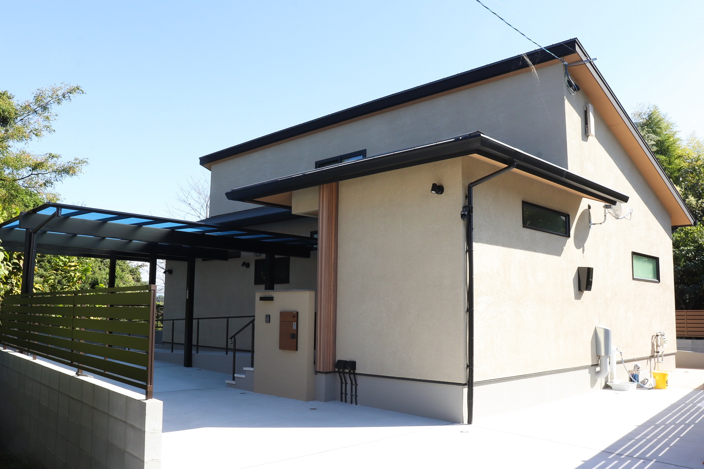 MT様邸は、弊社オリジナルの全館空調システムを採用し、季節を問わず家中どこにいても快適な室温を保てる設計です。さらに、外壁材には高耐久かつ美しい質感の塗り壁仕上げを採用し、長く快適に暮らしていただけるお住まいとなりました。